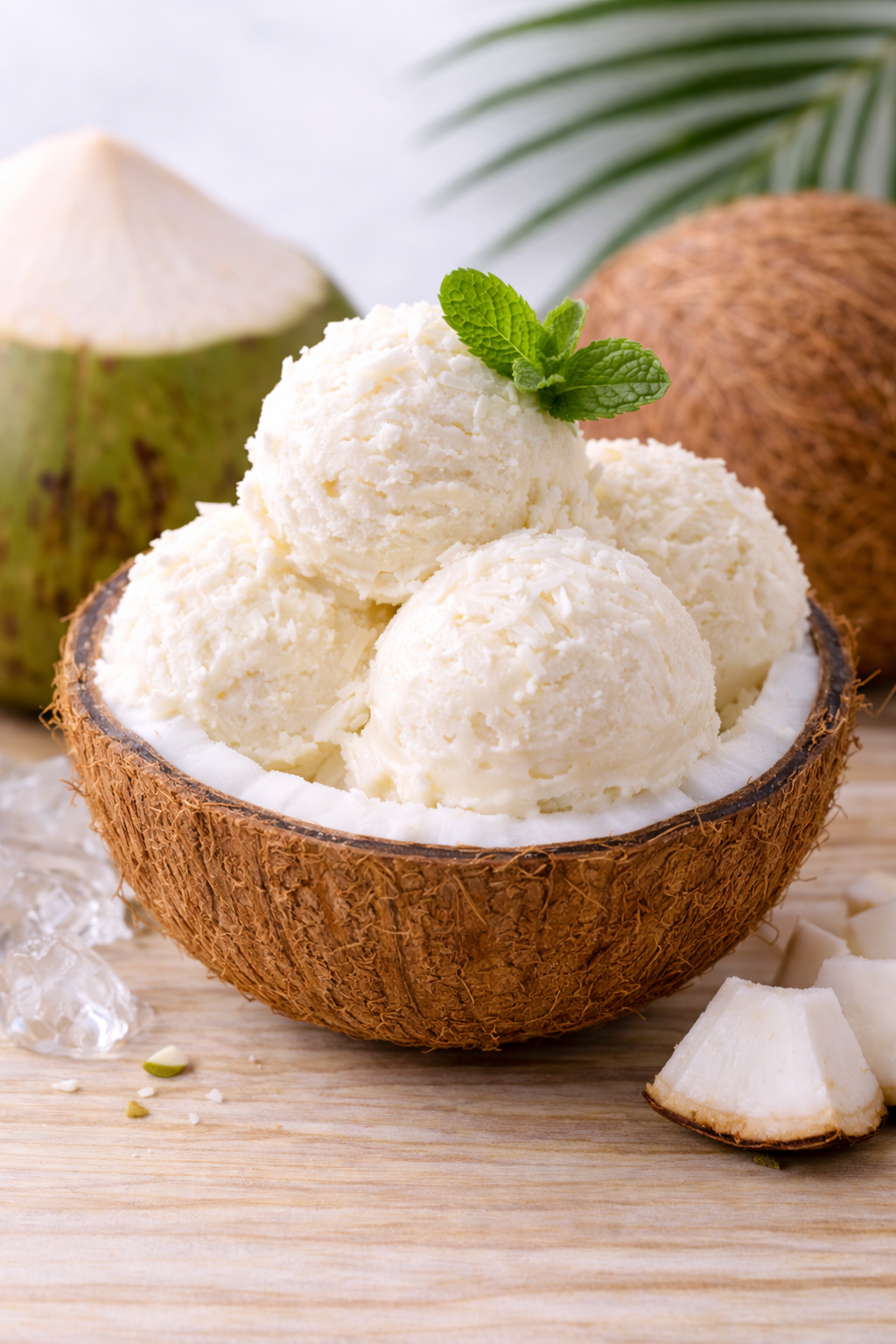 Coconut Ice Cream is a creamy and refreshing dessert made with real coconut milk and fresh coconut flavor. Smooth in texture and naturally rich in taste, it delivers a perfect balance of sweetness and tropical freshness.